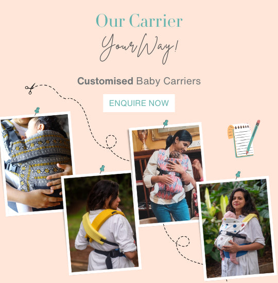 Send us your cherished fabric - your mom’s saree, cotton baby clothes, a gorgeous handwoven piece of fabric you admire or anything at all that is sentimental. You could also choose any fabric that you adore and just wish your baby could be wrapped in it. Whether you want a carrier that matches your wardrobe, or one that features a pattern you love, we’ve got you covered.